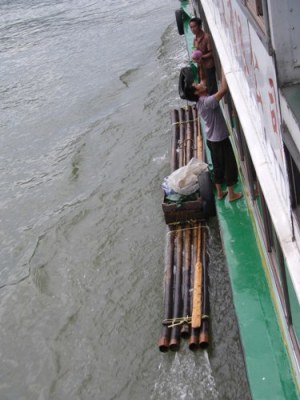その川下りの最中に某ソ○リアばりに襲撃してきた湖賊…ではなく土産物売りの人達。イカダで乗り付け