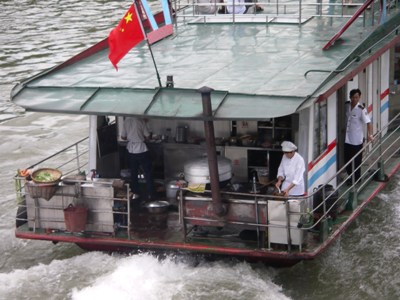 また、乗ってる時間が長いので食事も出ます。撮ったのは別の船ですが、後部が厨房になってました。