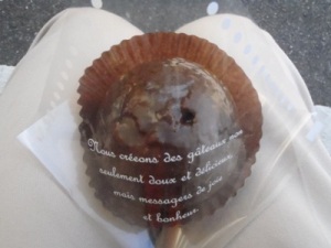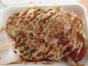 ここで買い食いした食べ物。たこ焼きは大阪の定番としてもう一つはかりんとう味のシューク